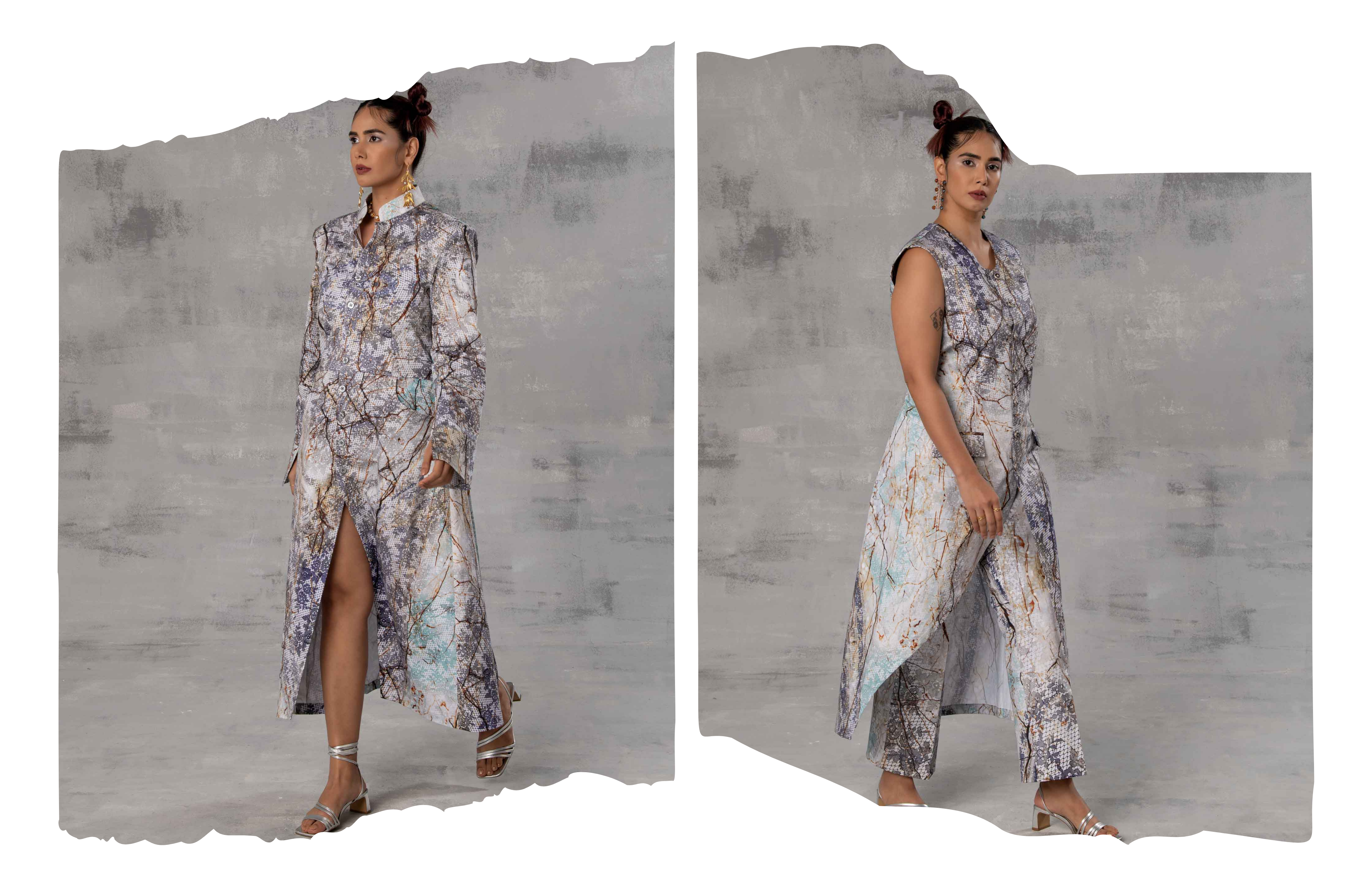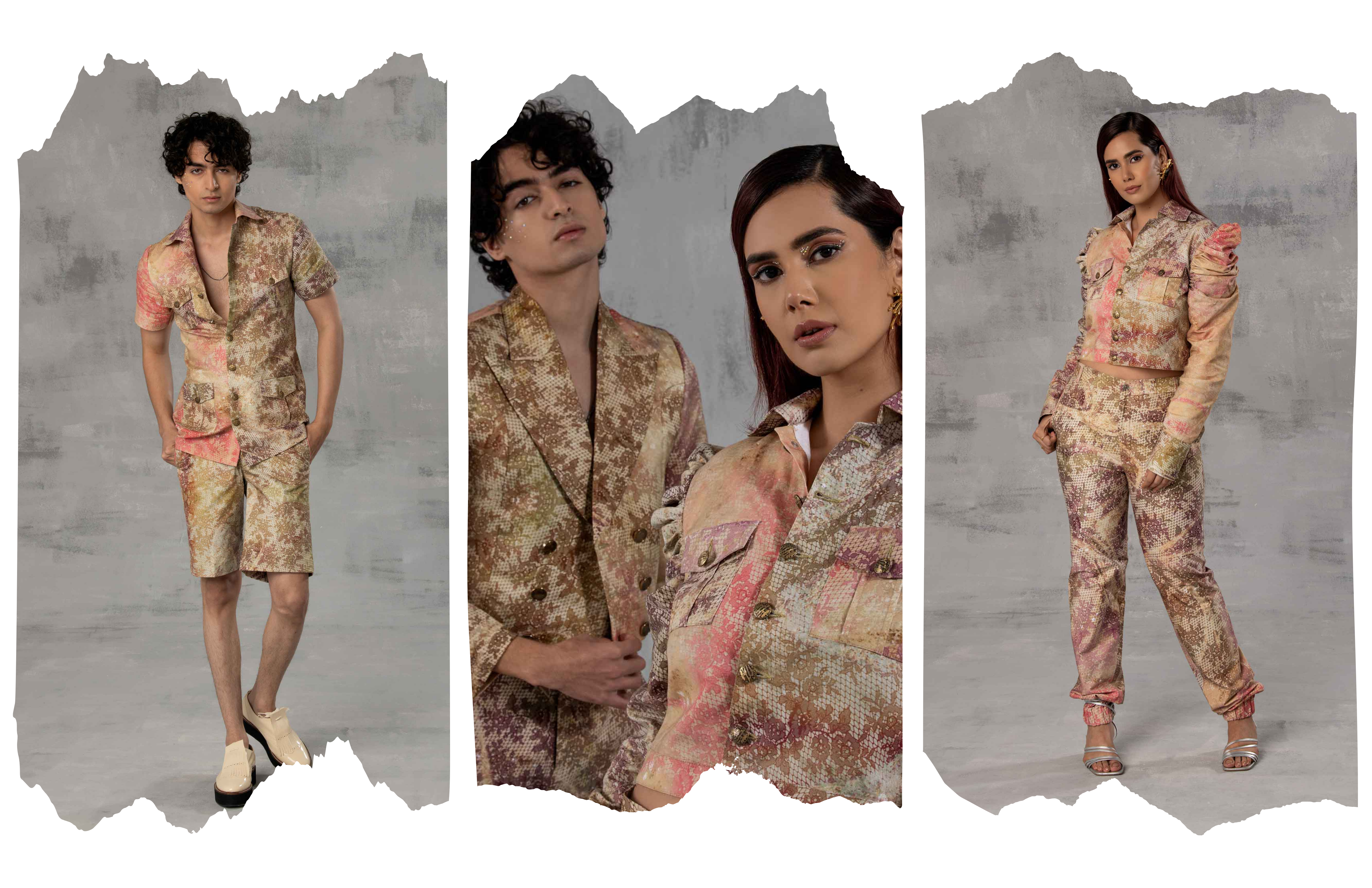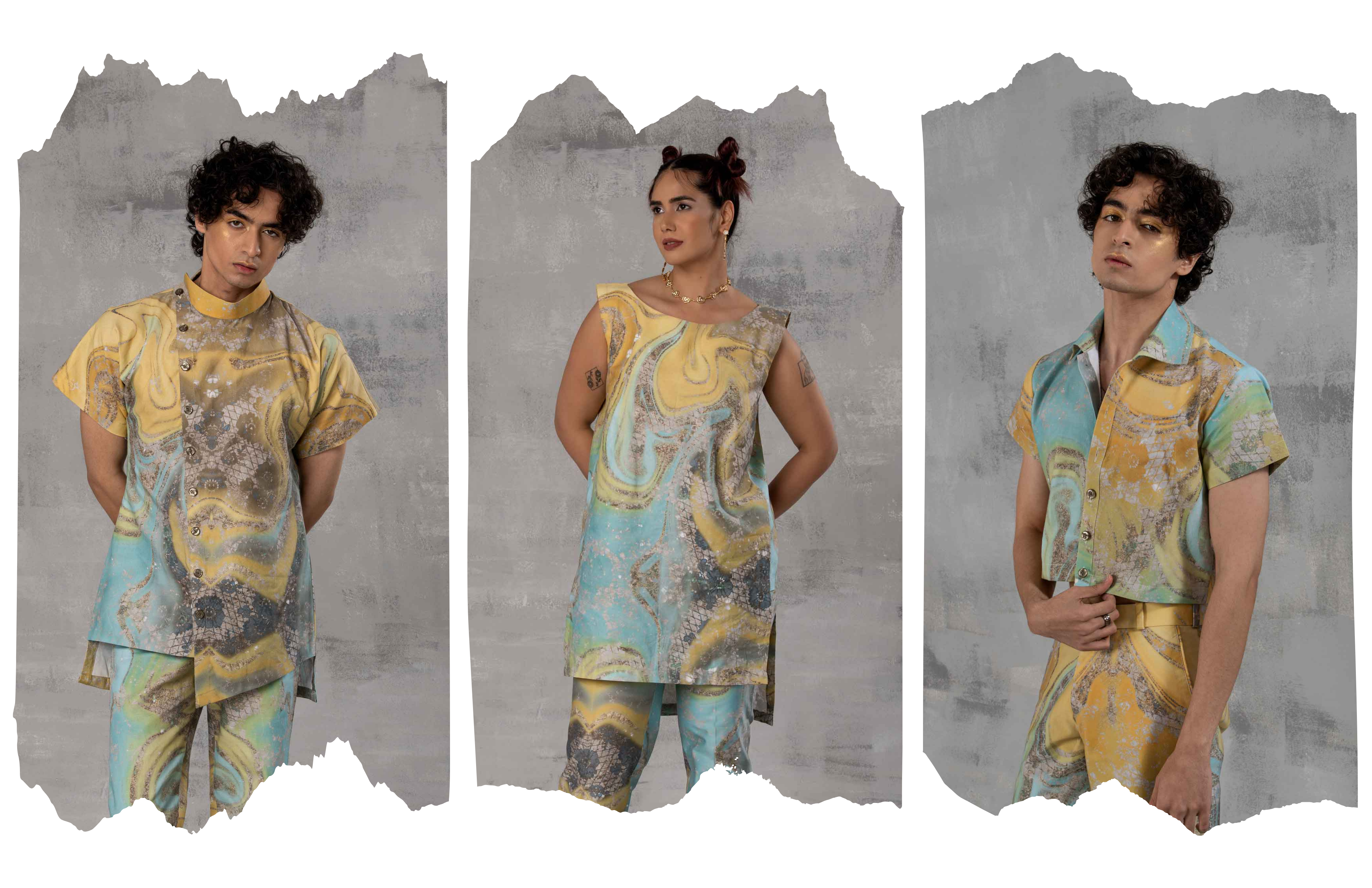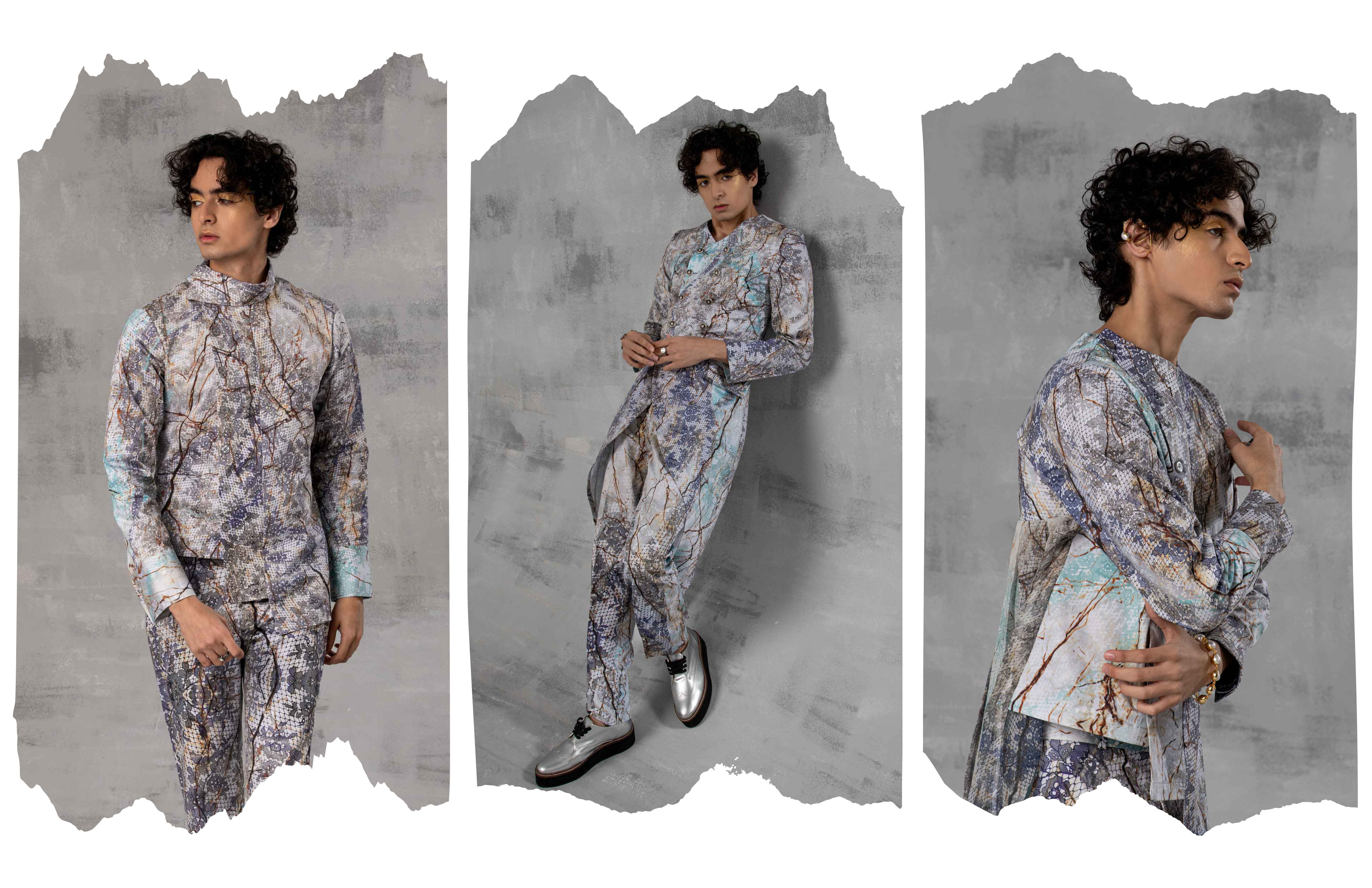 Inspired by the most timeless symbol of love and grandeur - the Taj Mahal, this collection weaves a magical narrative, embodying imperfection and inclusivity. The Taj Mahal, an ageless and historical wonder, guides a spellbinding fashion adventure. Picture the weathered beauty of marble etched into every thread, mirroring the Taj's oxidized textures. Garments express the monument's essence with lace replicating intricate Jalli work and digital marbling prints reflecting its ever-changing colors. Precious and semi-precious stones, reminiscent of Pietra Dura, are woven into the fabric, creating a textured and colorful symphony. Silhouettes transport us to the Mughal era, transcending gender boundaries. The fusion of historical grandeur and modern elegance yields a gender-neutral, all-inclusive fashion dream. The collection's enchanting colors mirror the Taj's transformation from soft pinks at sunrise to brilliant afternoon whites and bronzed-oranges at sunset. Under moonlight, the Taj shimmers with a mesmerizing blue.