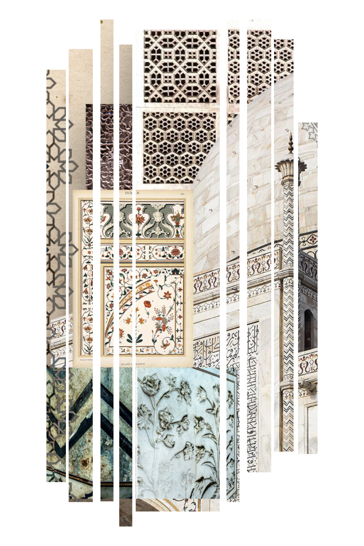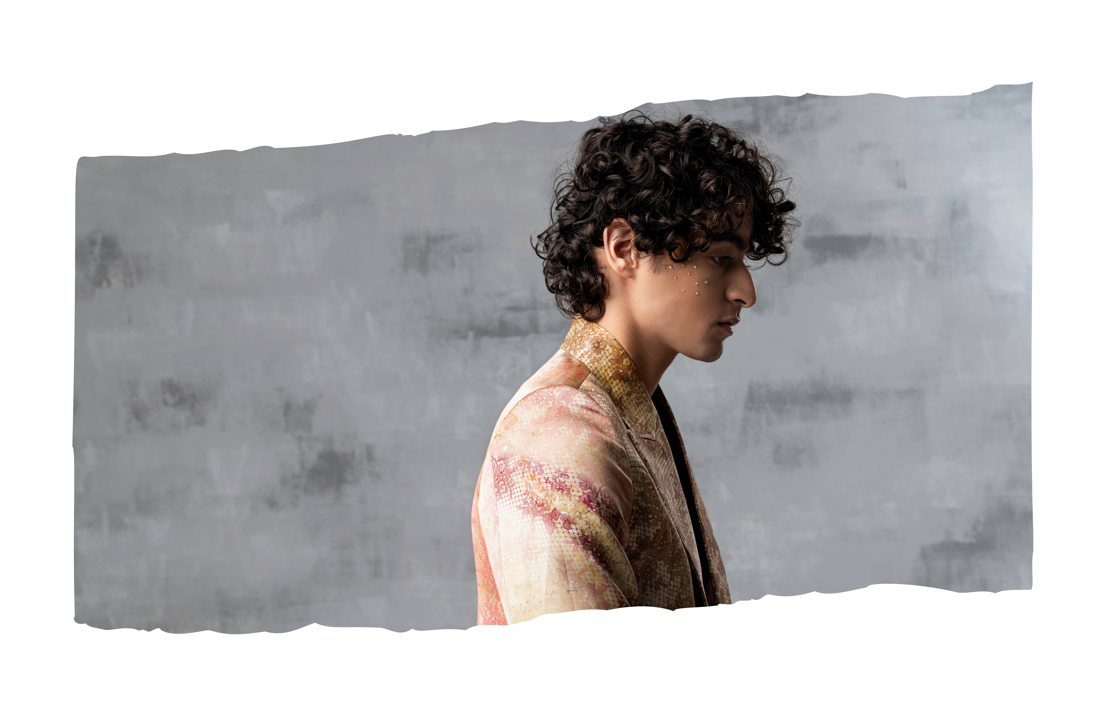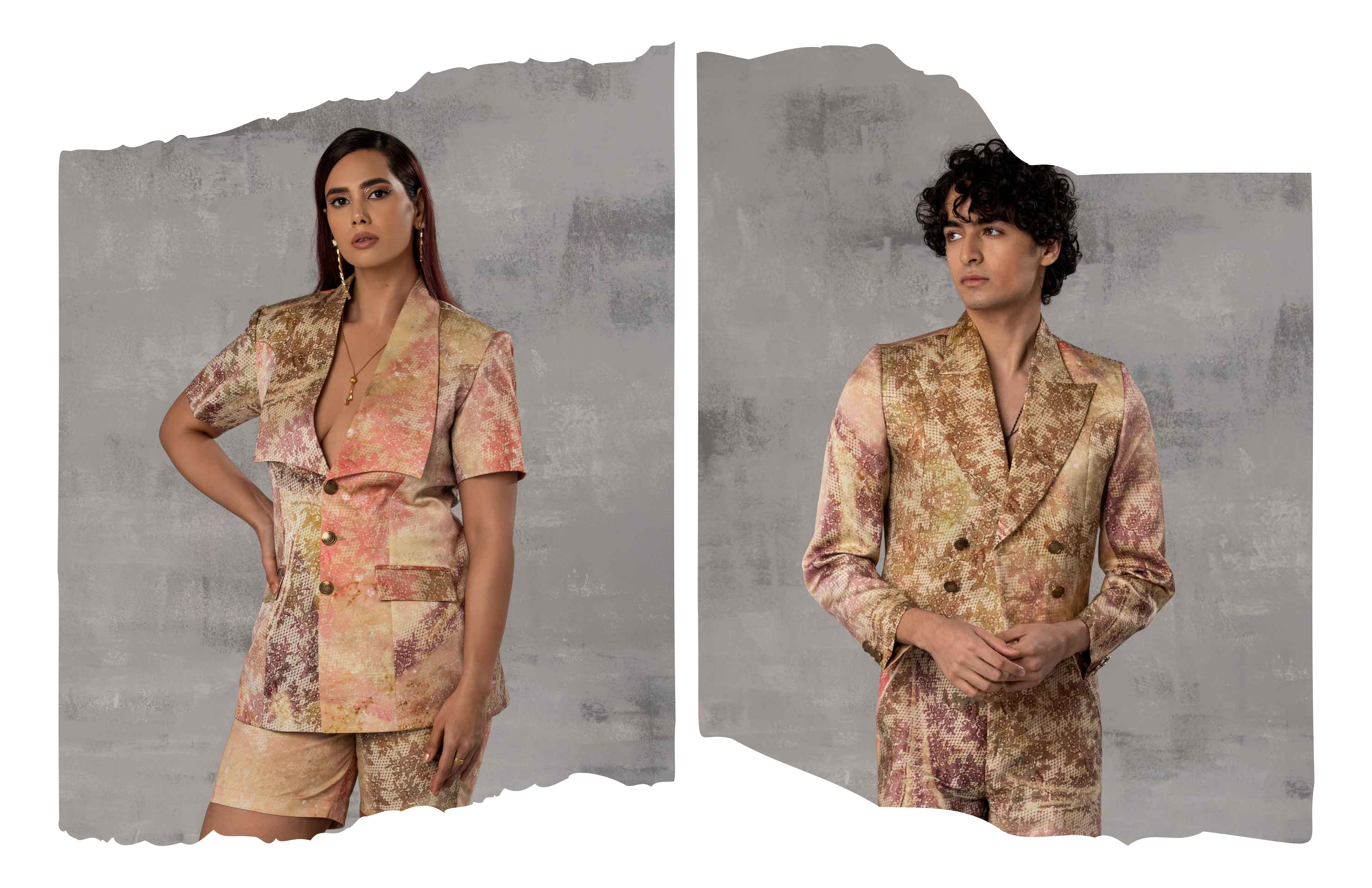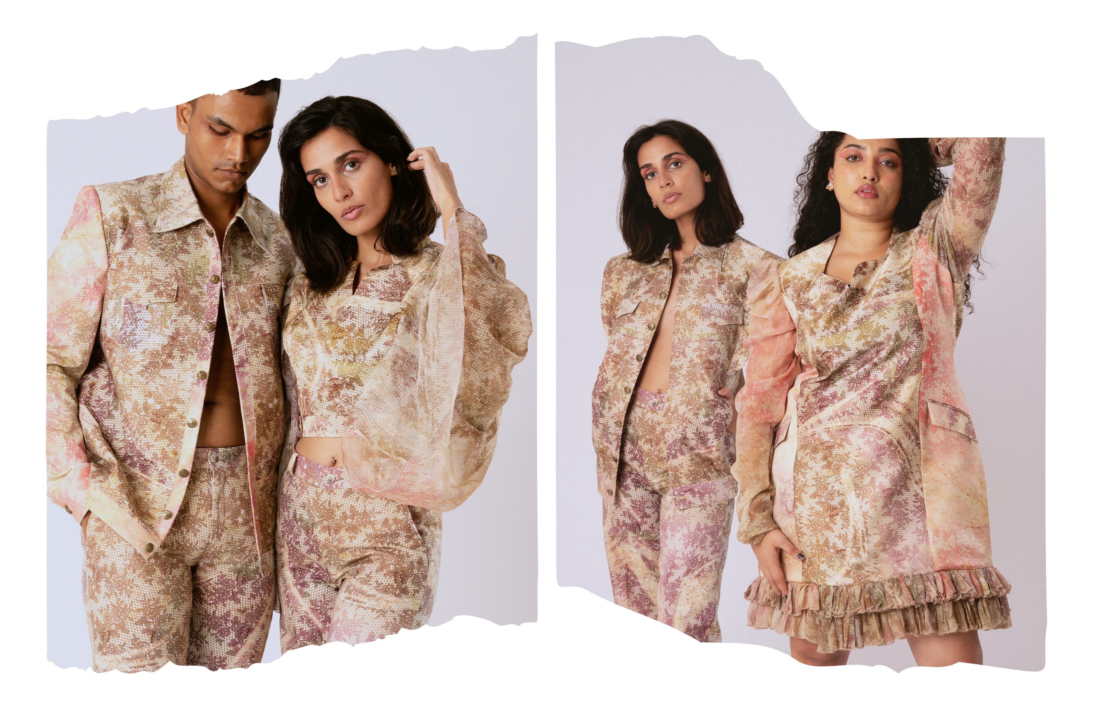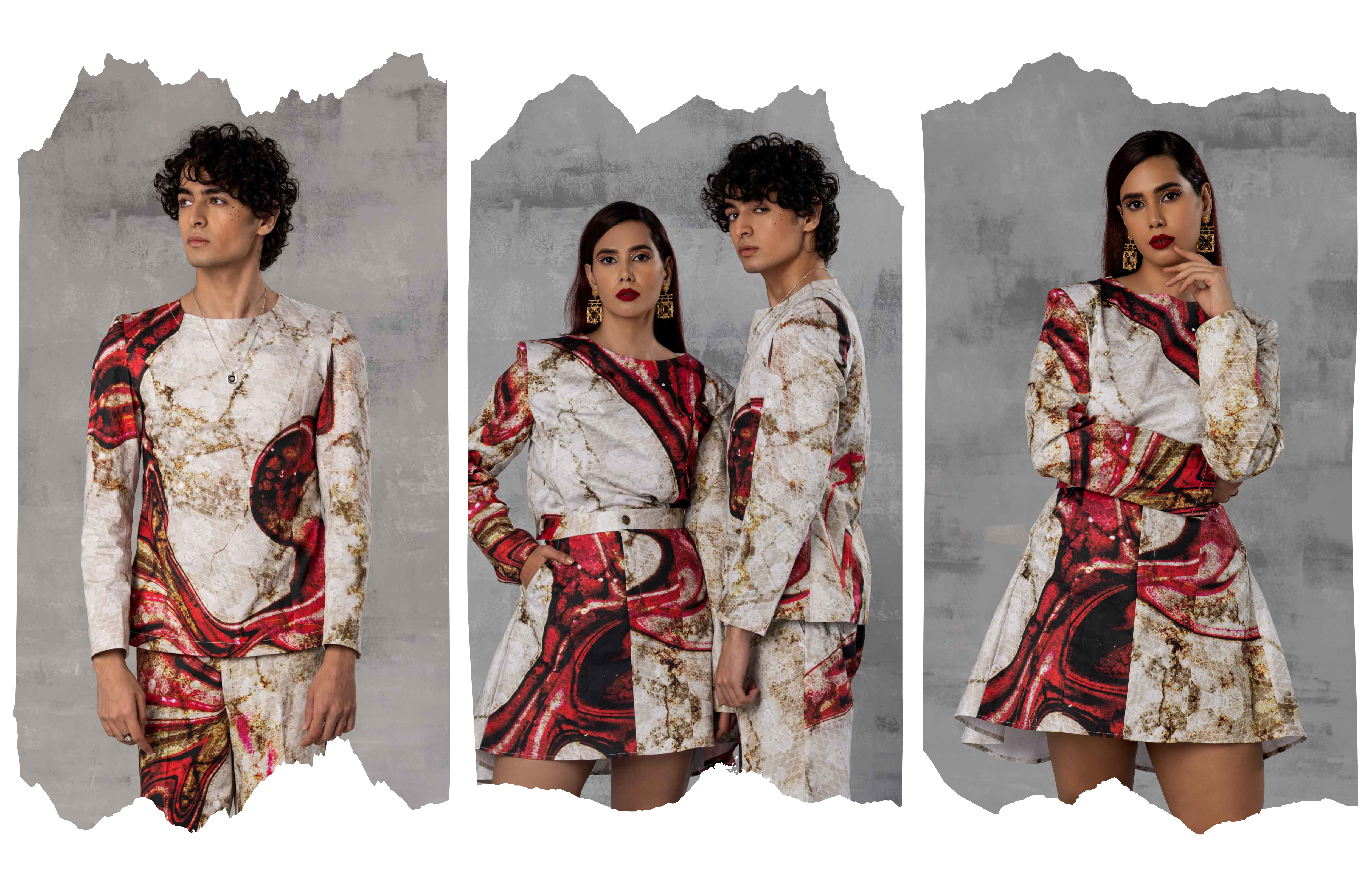 Inspired by the most timeless symbol of love and grandeur - the Taj Mahal, this collection weaves a magical narrative, embodying imperfection and inclusivity. The Taj Mahal, an ageless and historical wonder, guides a spellbinding fashion adventure. Picture the weathered beauty of marble etched into every thread, mirroring the Taj's oxidized textures. Garments express the monument's essence with lace replicating intricate Jalli work and digital marbling prints reflecting its ever-changing colors. Precious and semi-precious stones, reminiscent of Pietra Dura, are woven into the fabric, creating a textured and colorful symphony. Silhouettes transport us to the Mughal era, transcending gender boundaries. The fusion of historical grandeur and modern elegance yields a gender-neutral, all-inclusive fashion dream. The collection's enchanting colors mirror the Taj's transformation from soft pinks at sunrise to brilliant afternoon whites and bronzed-oranges at sunset. Under moonlight, the Taj shimmers with a mesmerizing blue.