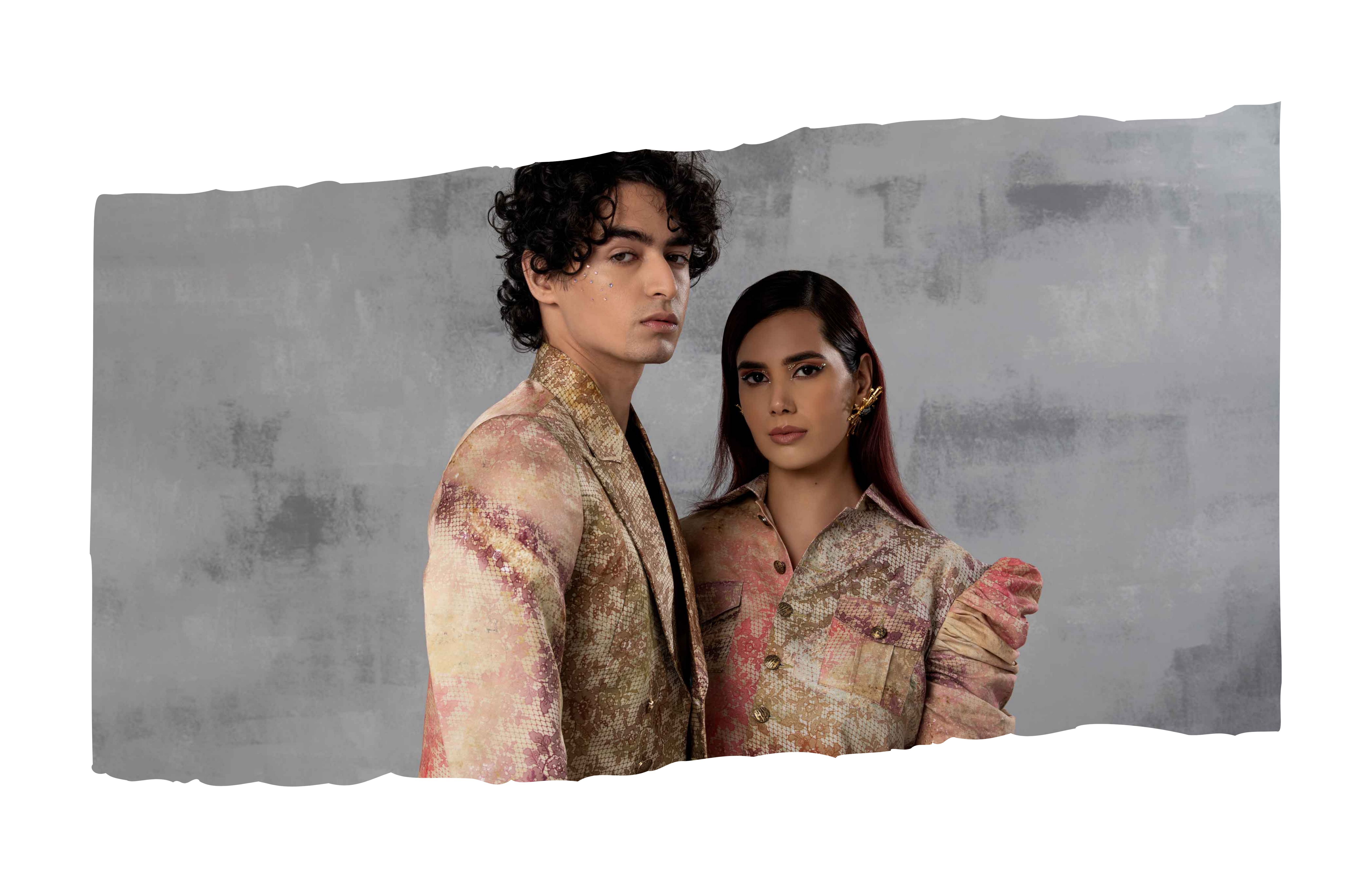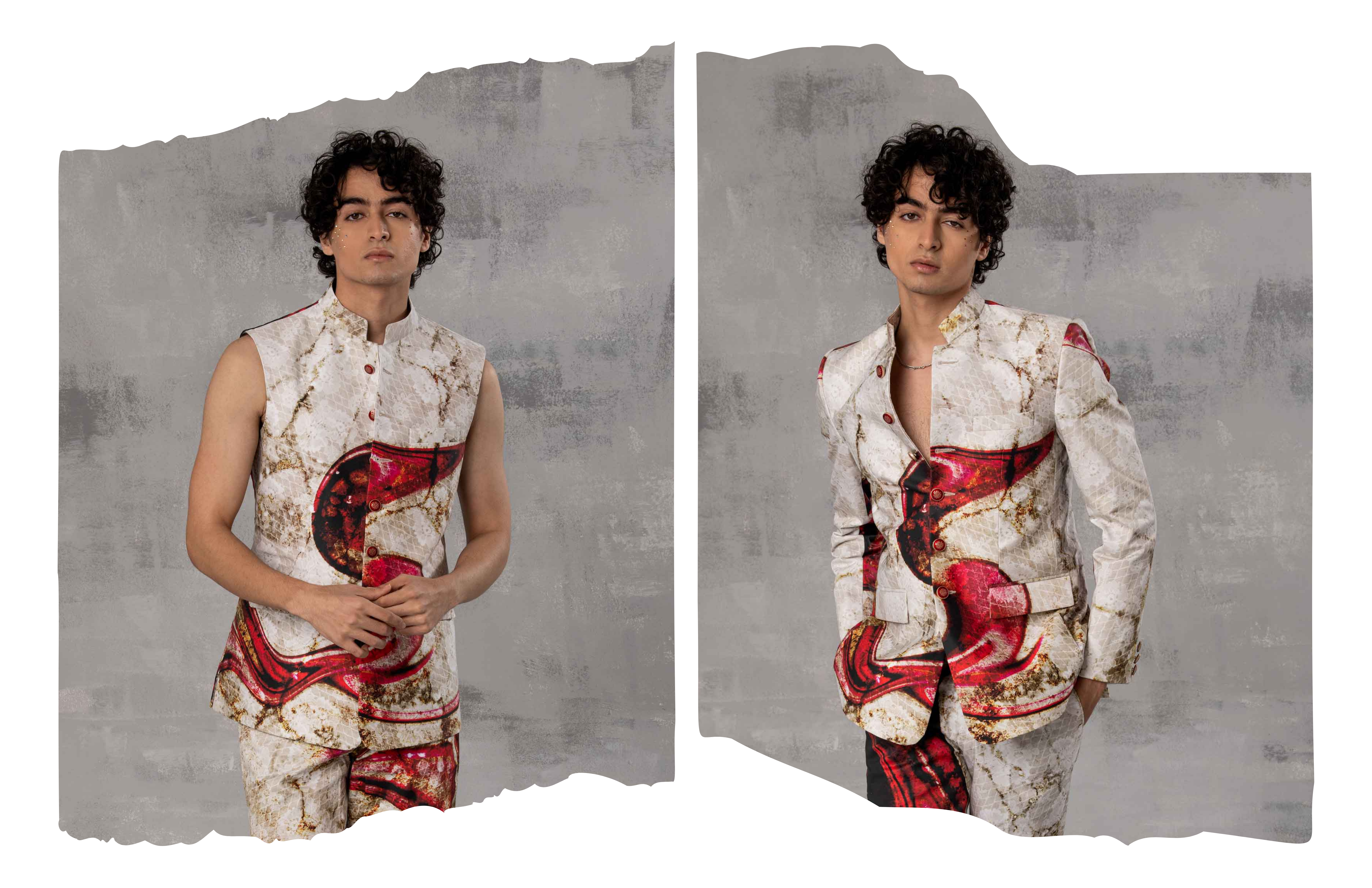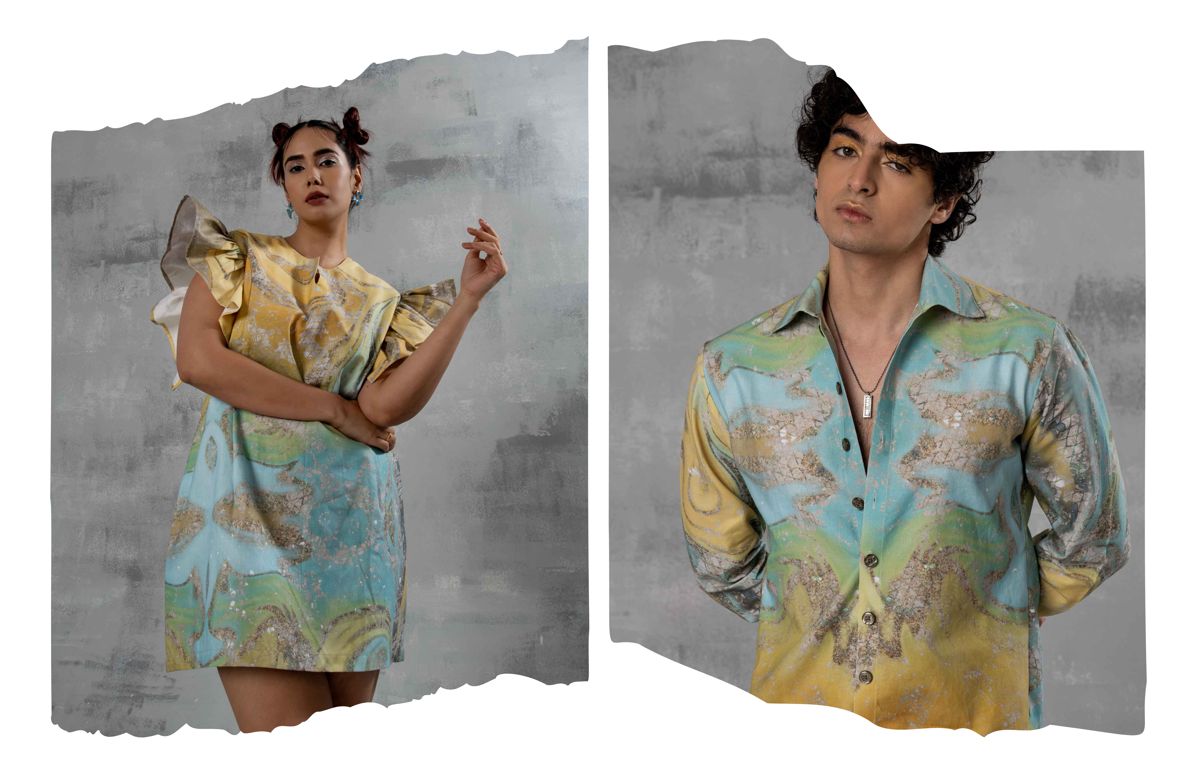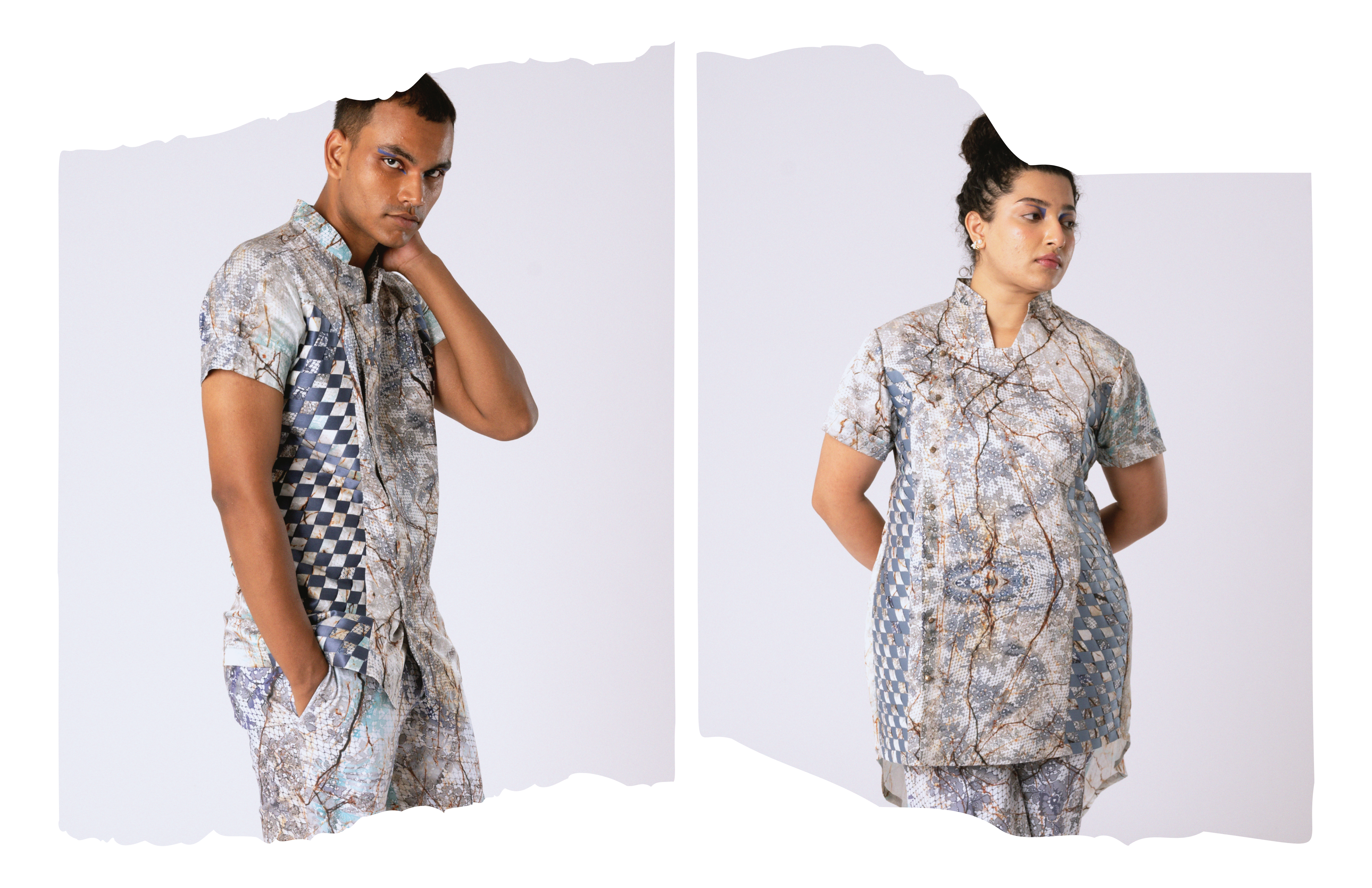Inspired by the most timeless symbol of love and grandeur - the Taj Mahal, this collection weaves a magical narrative, embodying imperfection and inclusivity. The Taj Mahal, an ageless and historical wonder, guides a spellbinding fashion adventure. Picture the weathered beauty of marble etched into every thread, mirroring the Taj's oxidized textures. Garments express the monument's essence with lace replicating intricate Jalli work and digital marbling prints reflecting its ever-changing colors. Precious and semi-precious stones, reminiscent of Pietra Dura, are woven into the fabric, creating a textured and colorful symphony. Silhouettes transport us to the Mughal era, transcending gender boundaries. The fusion of historical grandeur and modern elegance yields a gender-neutral, all-inclusive fashion dream. The collection's enchanting colors mirror the Taj's transformation from soft pinks at sunrise to brilliant afternoon whites and bronzed-oranges at sunset. Under moonlight, the Taj shimmers with a mesmerizing blue.