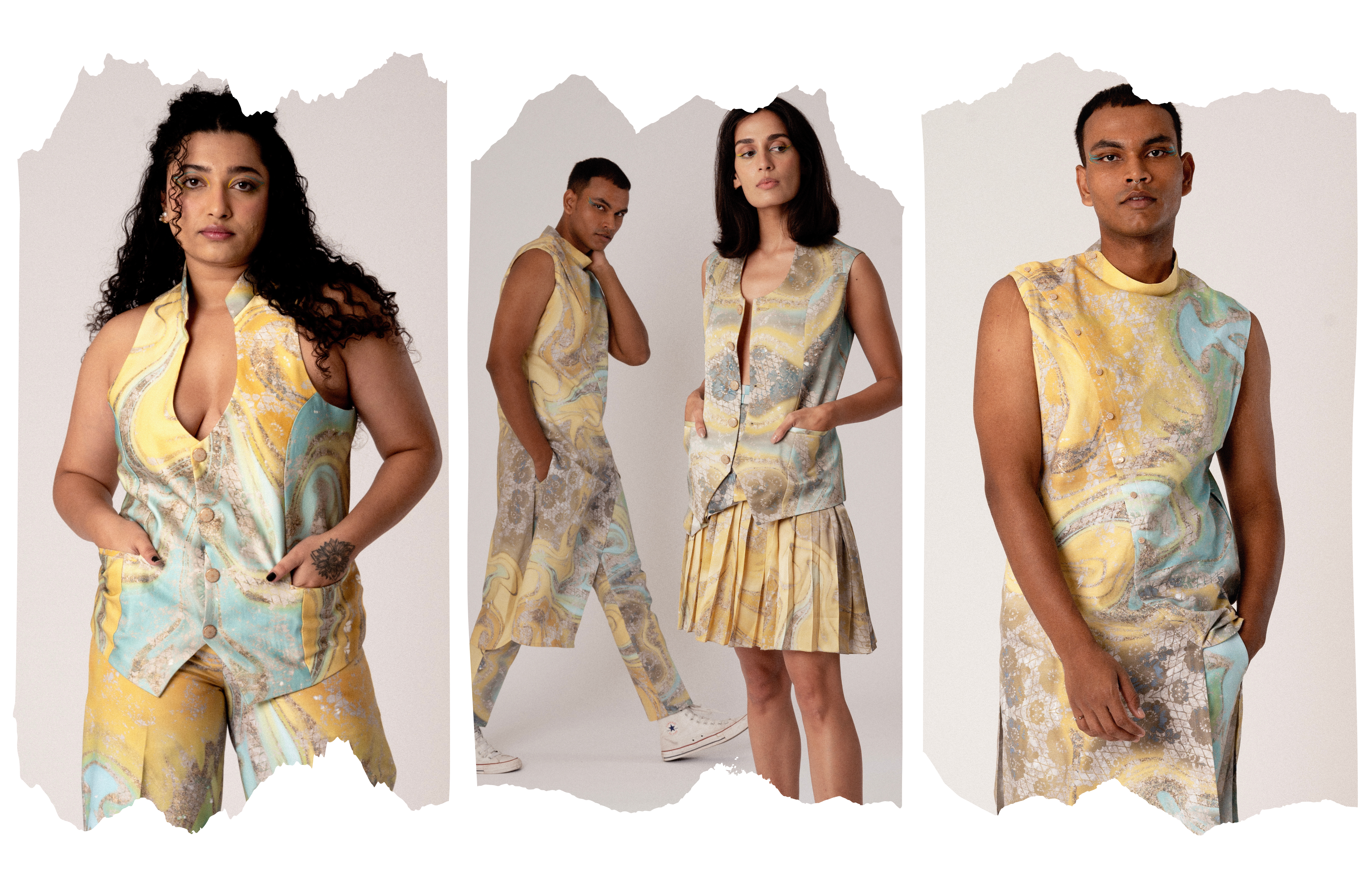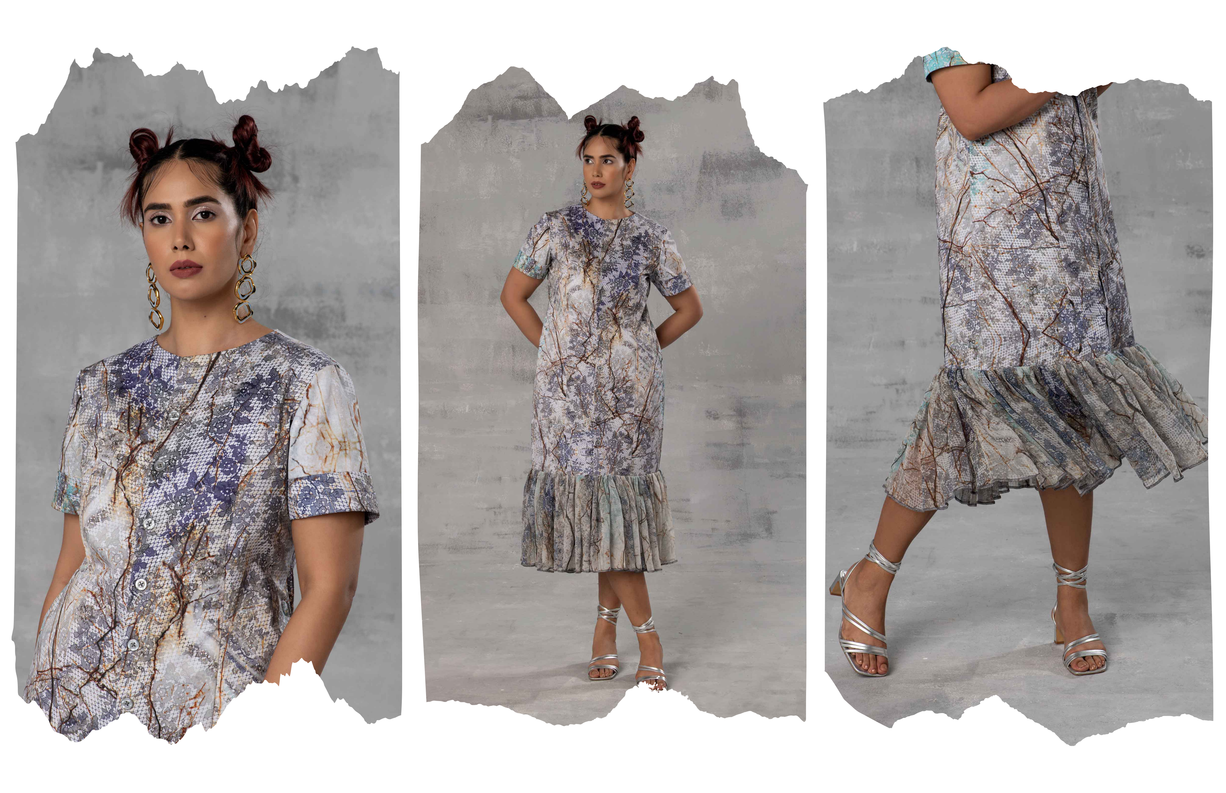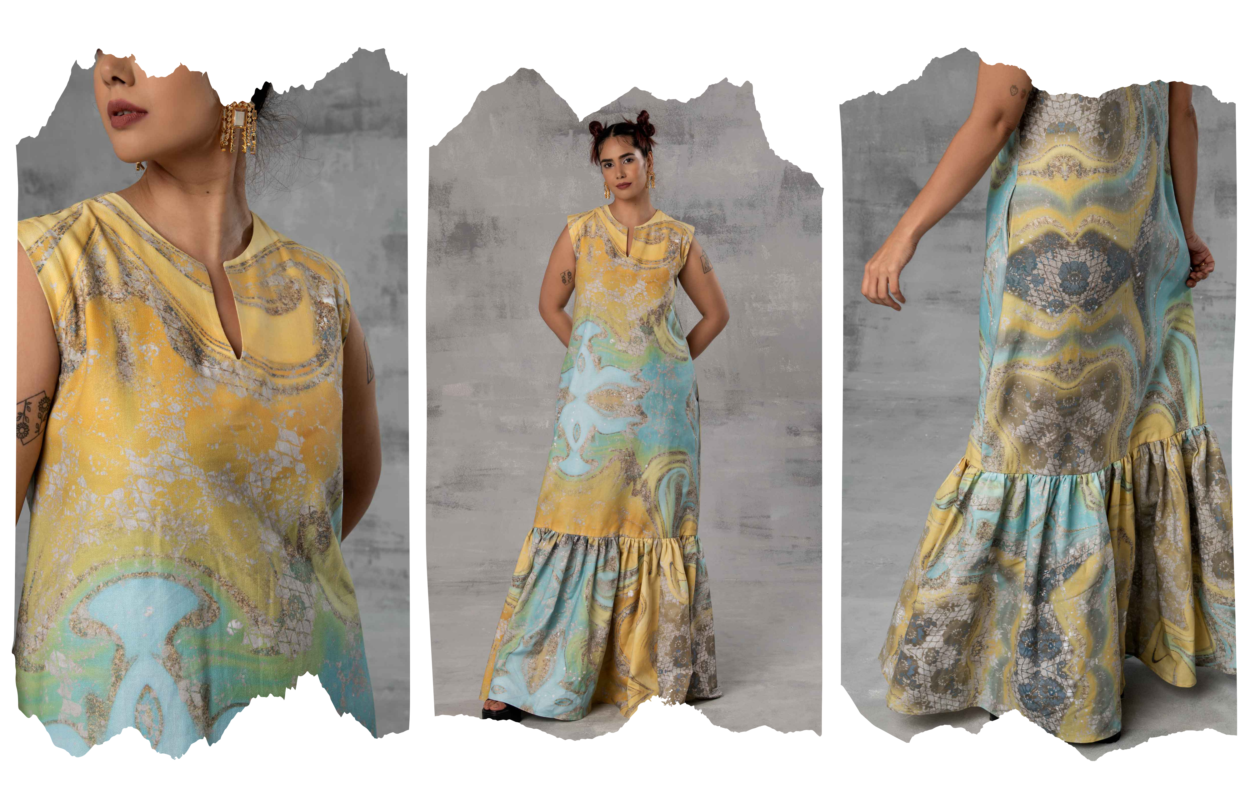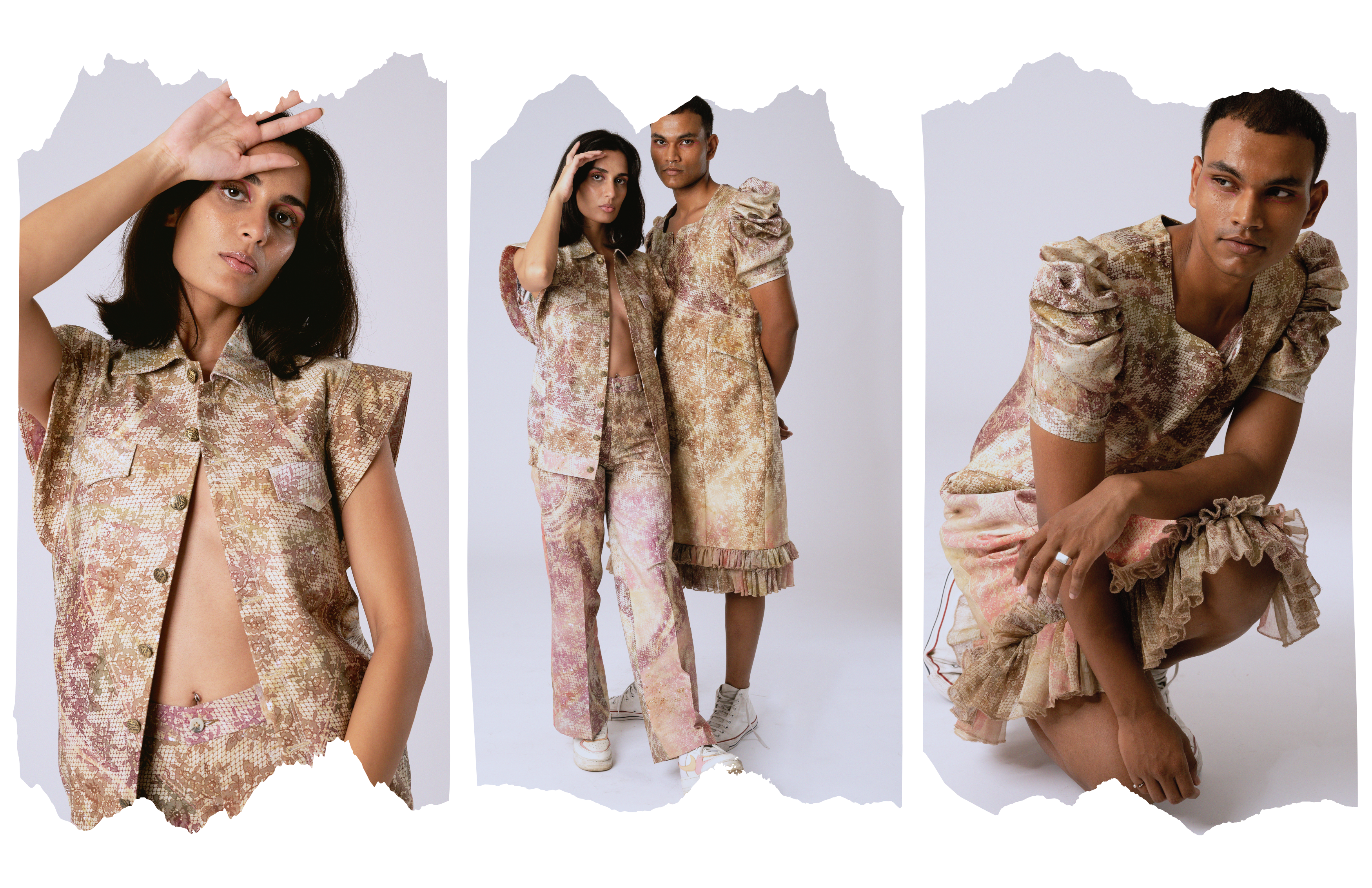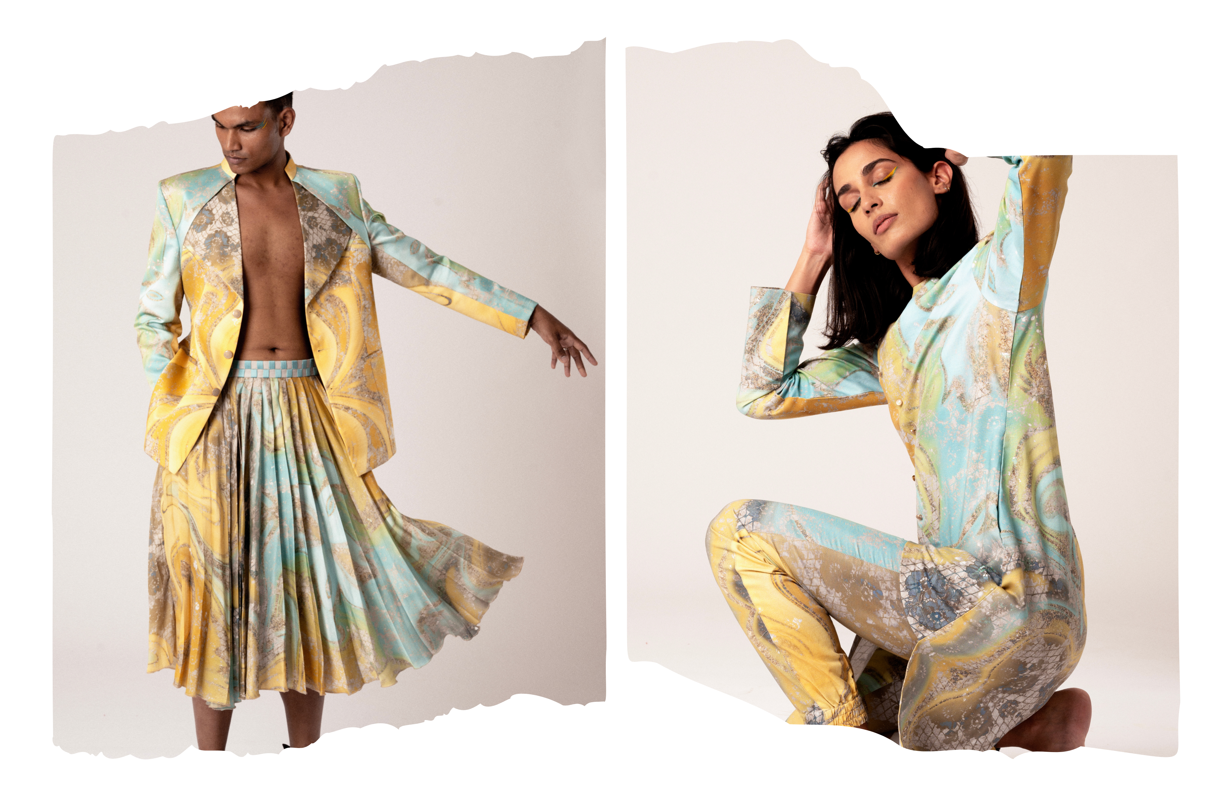 Inspired by the most timeless symbol of love and grandeur - the Taj Mahal, this collection weaves a magical narrative, embodying imperfection and inclusivity. The Taj Mahal, an ageless and historical wonder, guides a spellbinding fashion adventure. Picture the weathered beauty of marble etched into every thread, mirroring the Taj's oxidized textures. Garments express the monument's essence with lace replicating intricate Jalli work and digital marbling prints reflecting its ever-changing colors. Precious and semi-precious stones, reminiscent of Pietra Dura, are woven into the fabric, creating a textured and colorful symphony. Silhouettes transport us to the Mughal era, transcending gender boundaries. The fusion of historical grandeur and modern elegance yields a gender-neutral, all-inclusive fashion dream. The collection's enchanting colors mirror the Taj's transformation from soft pinks at sunrise to brilliant afternoon whites and bronzed-oranges at sunset. Under moonlight, the Taj shimmers with a mesmerizing blue.