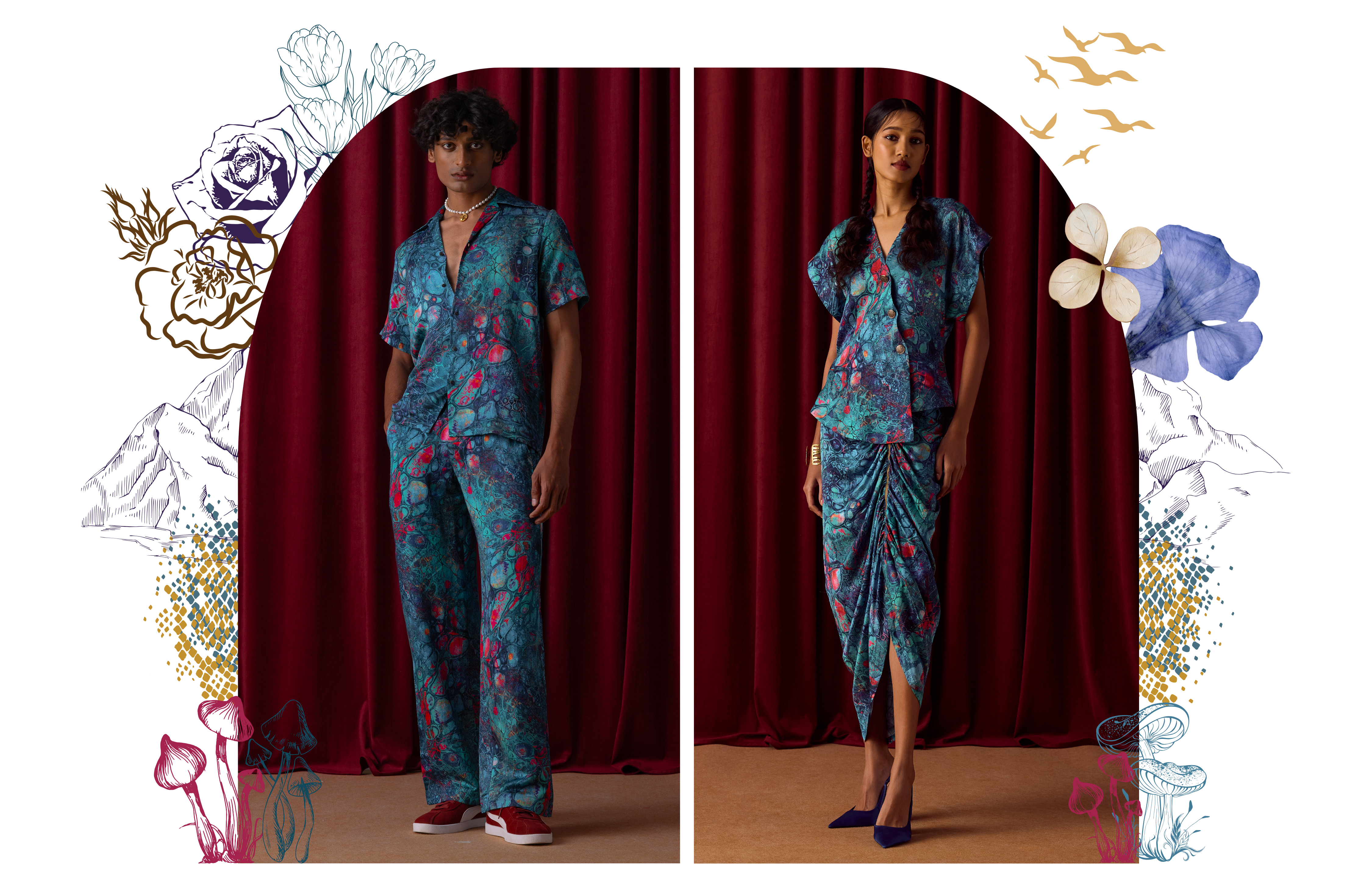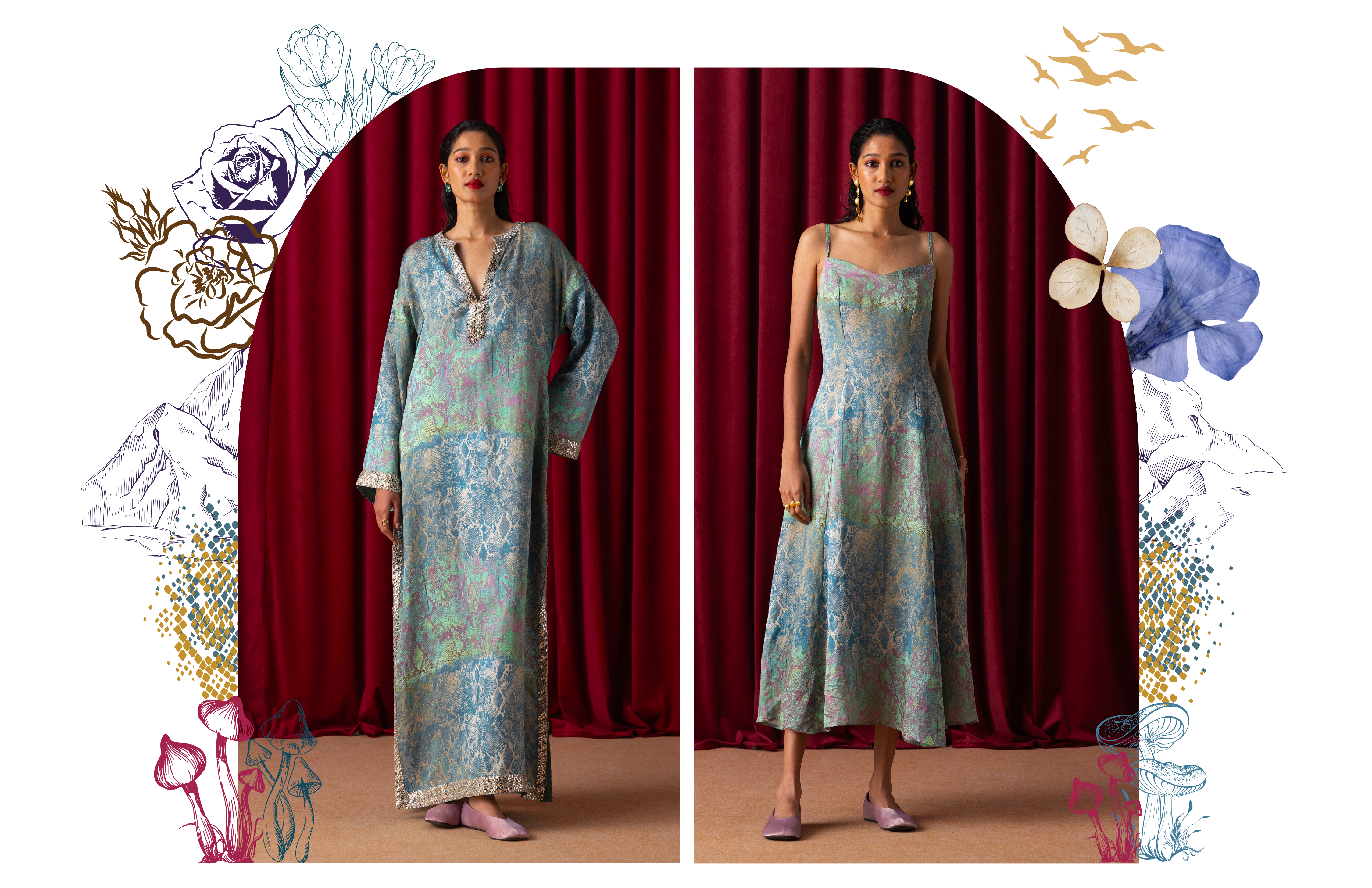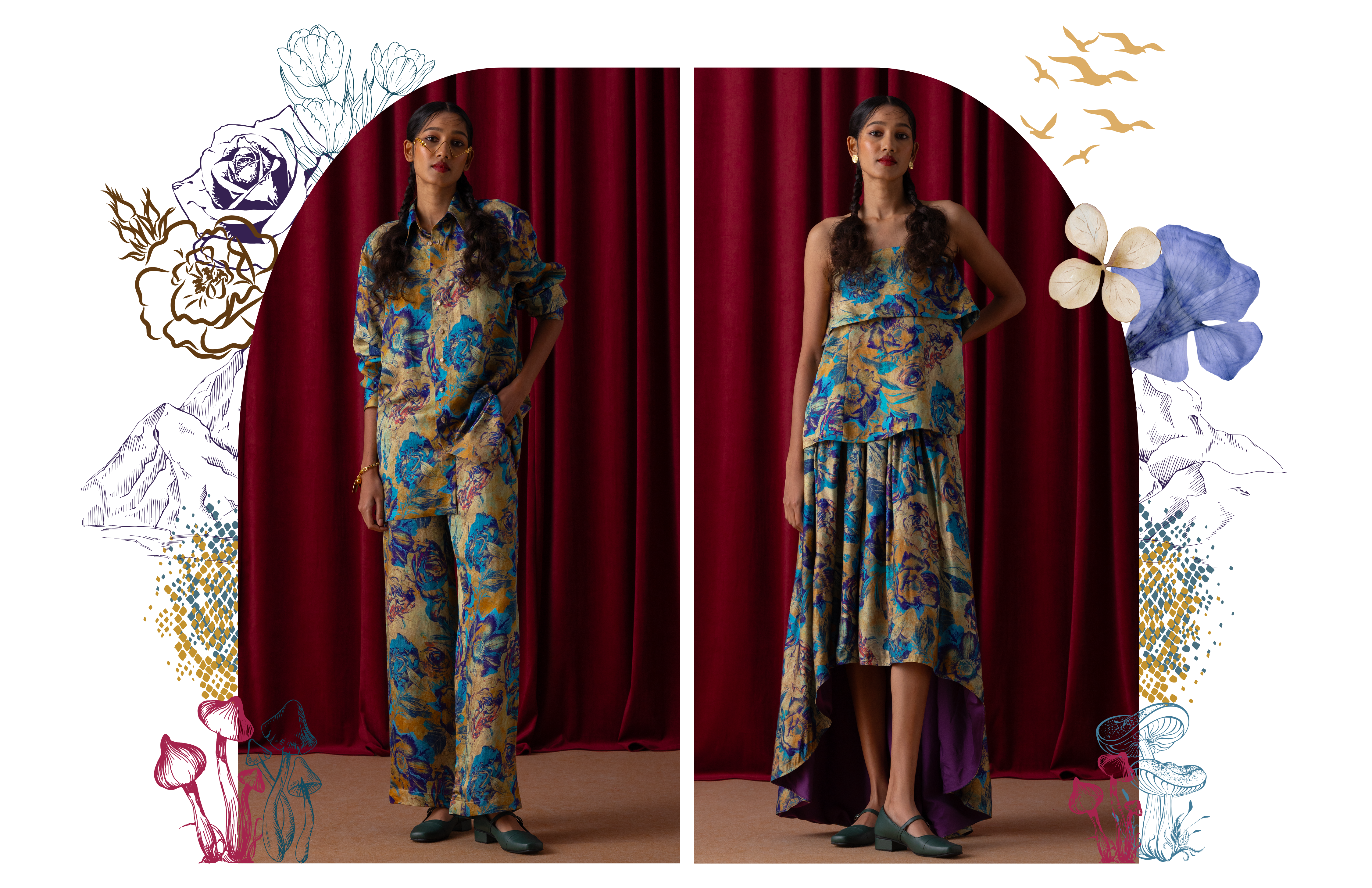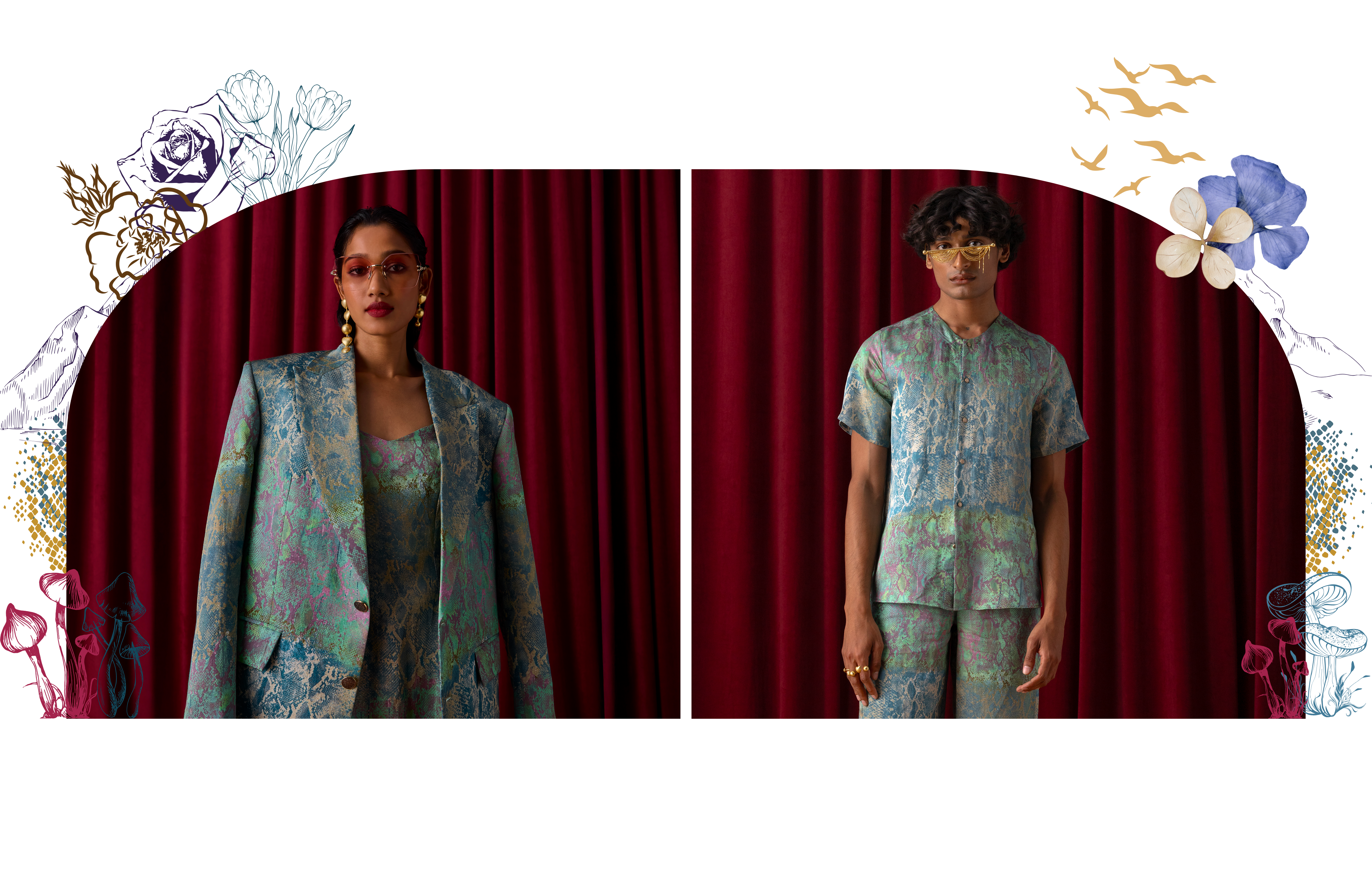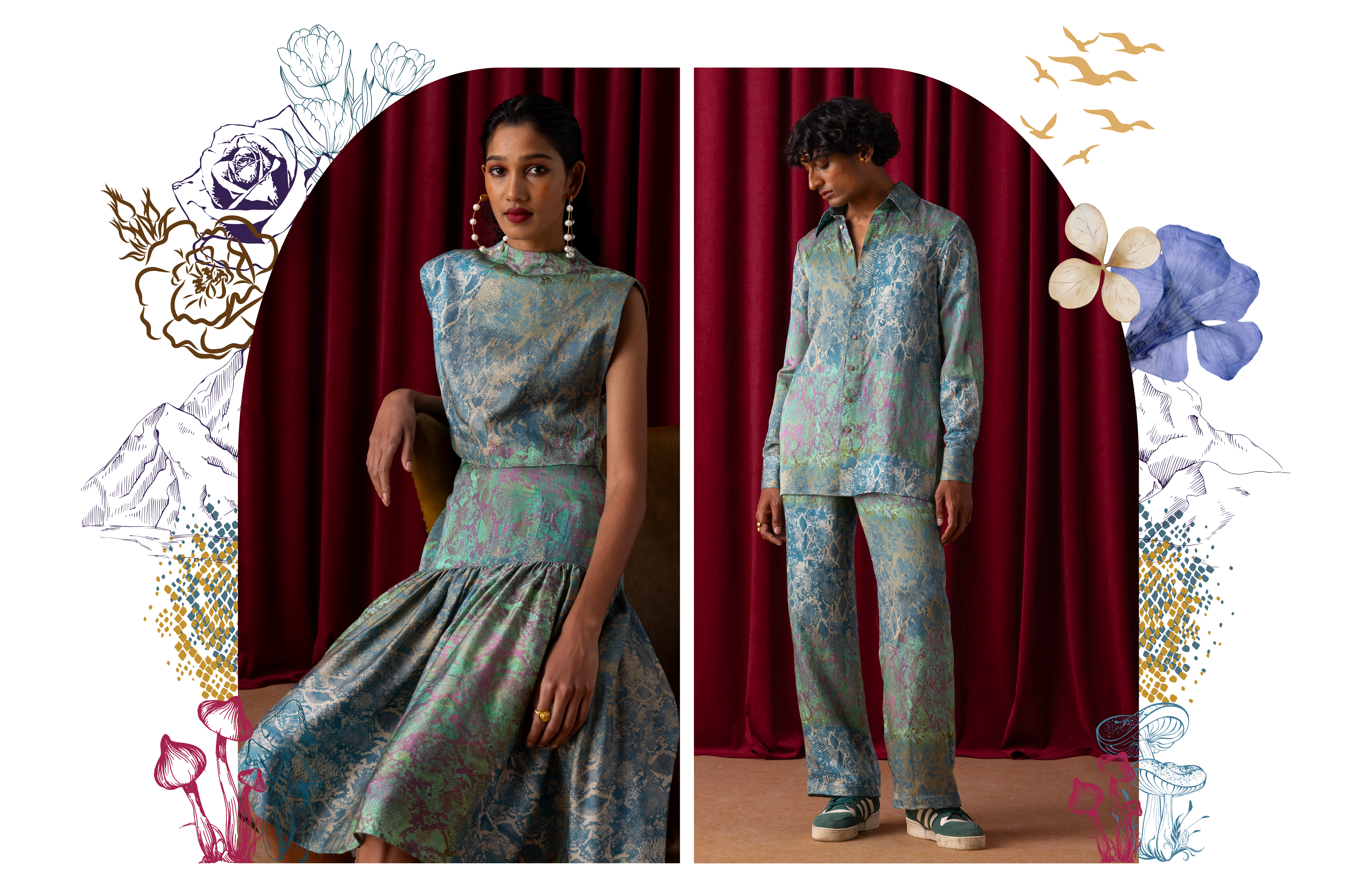 Wildoria takes inspiration from the Nilgiris in India’s Western Ghats, known for its rich biodiversity and scenic landscapes. The collection reimagines this natural world through a blue-green-gold palette that mirrors the region’s forests, mist, and golden light. Each piece reflects the Nilgiris’ essence, floral motifs draw from the blue flowers that bloom during golden hour, while snake-inspired prints capture the fluid elegance of the region’s fauna. Fungi patterns bring in the forest’s nocturnal beauty, adding depth and intrigue. By blending these natural elements with modern design, Wildoria translates the untamed elegance of the Nilgiris into contemporary silhouettes that carry the spirit of its landscape and life.