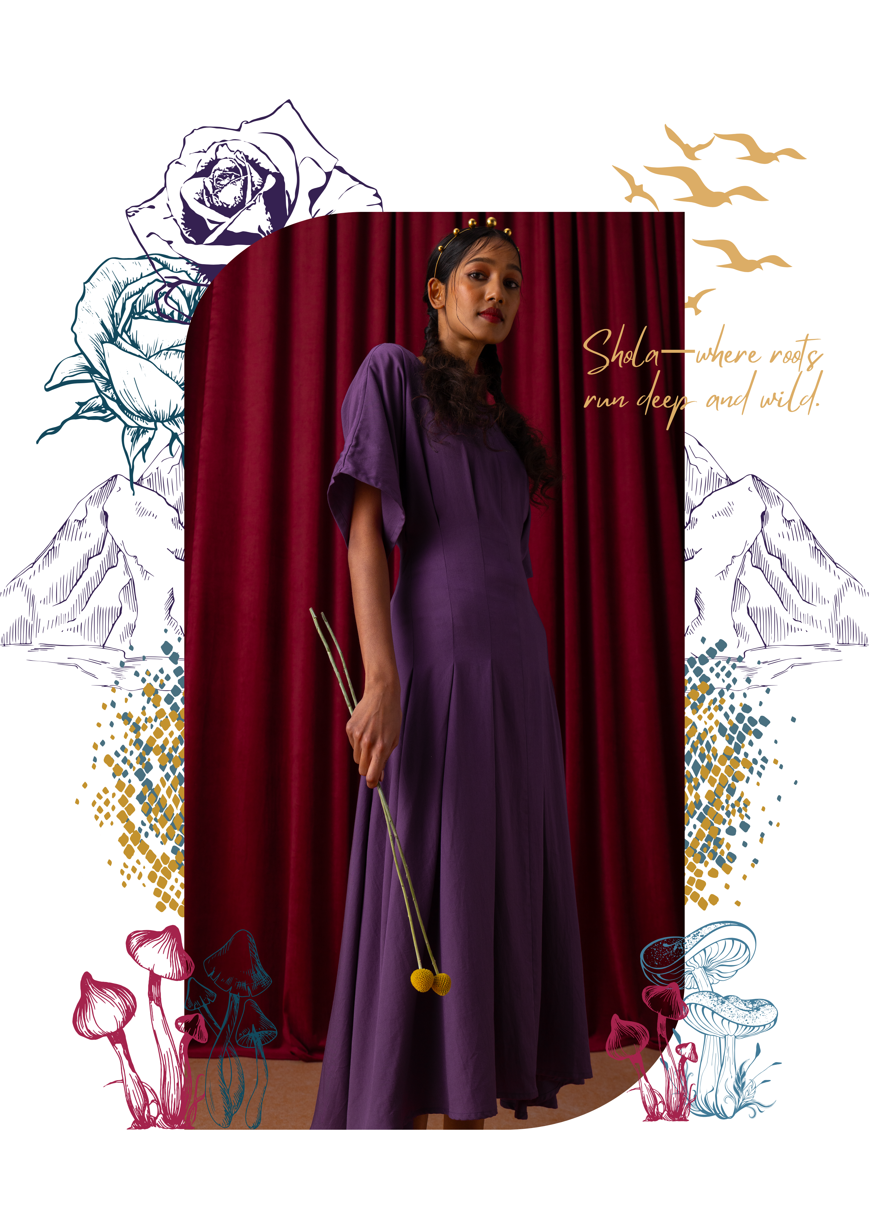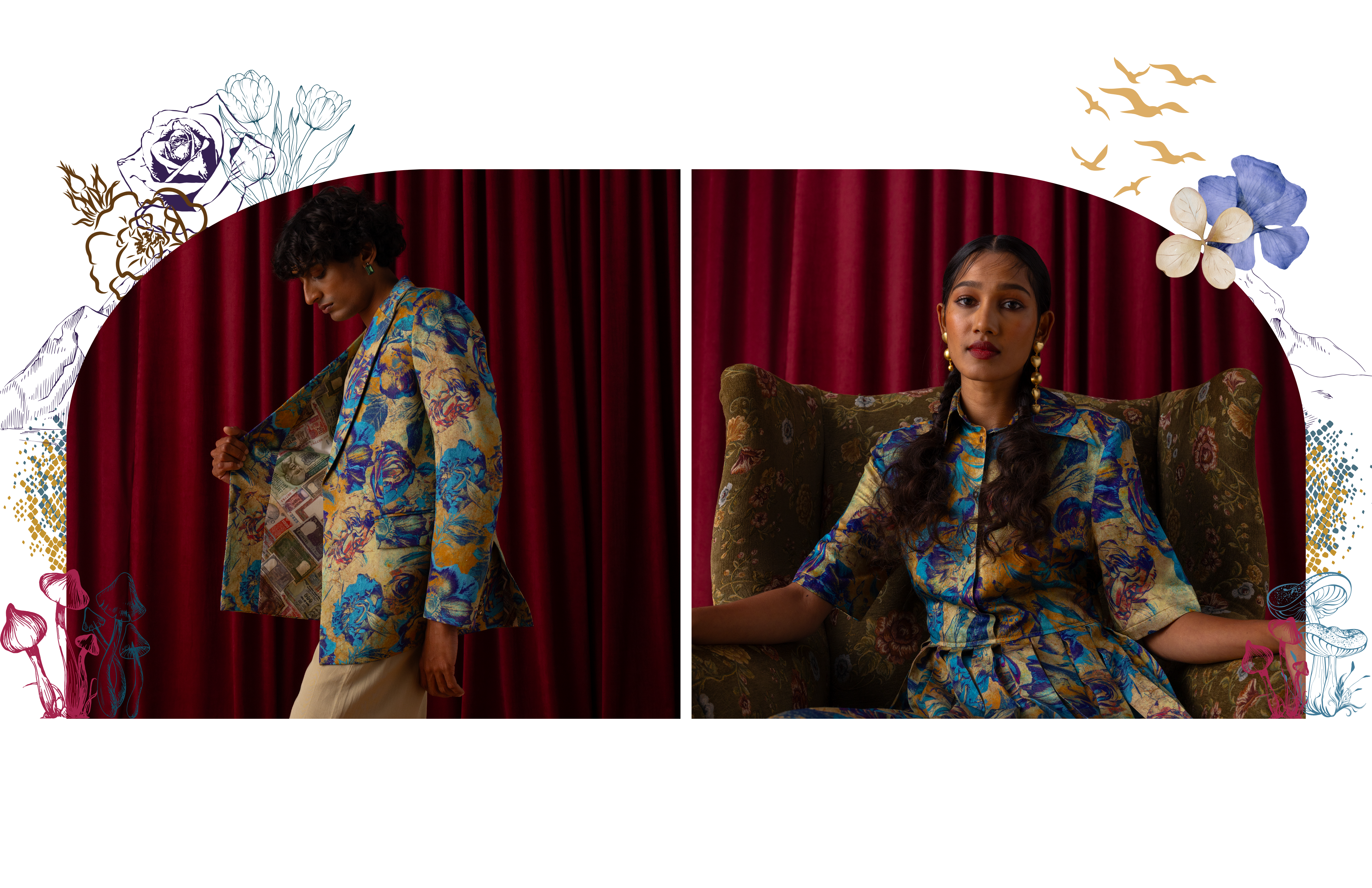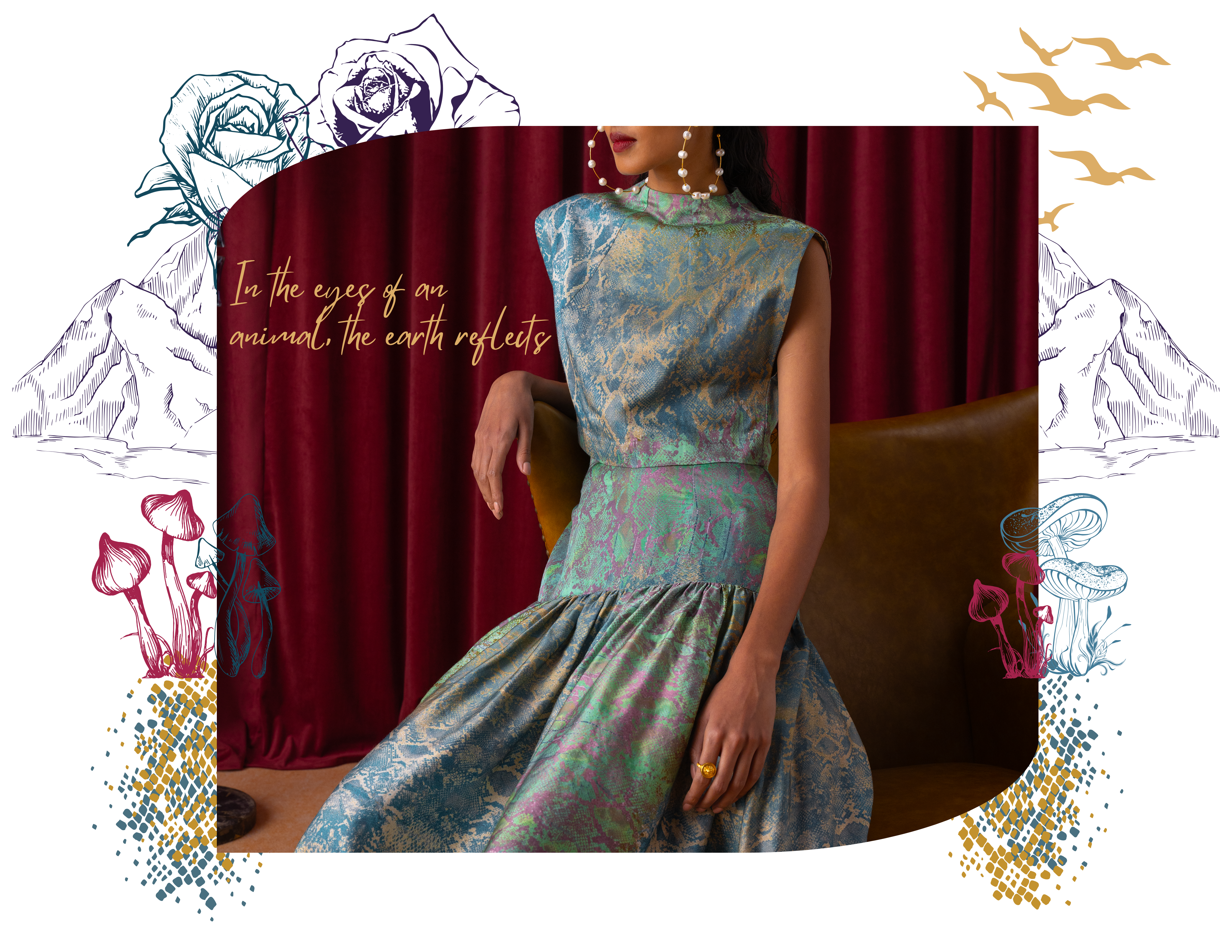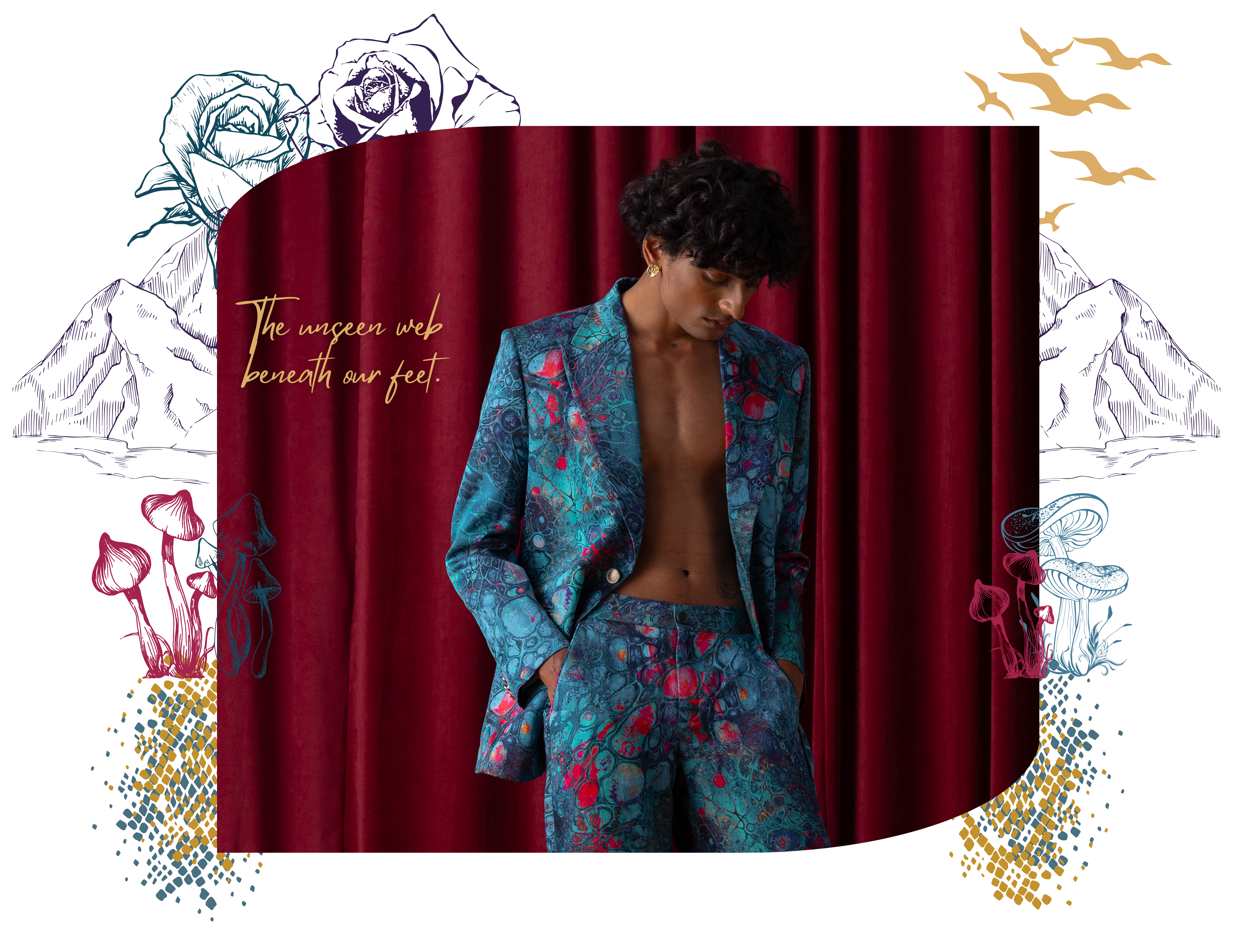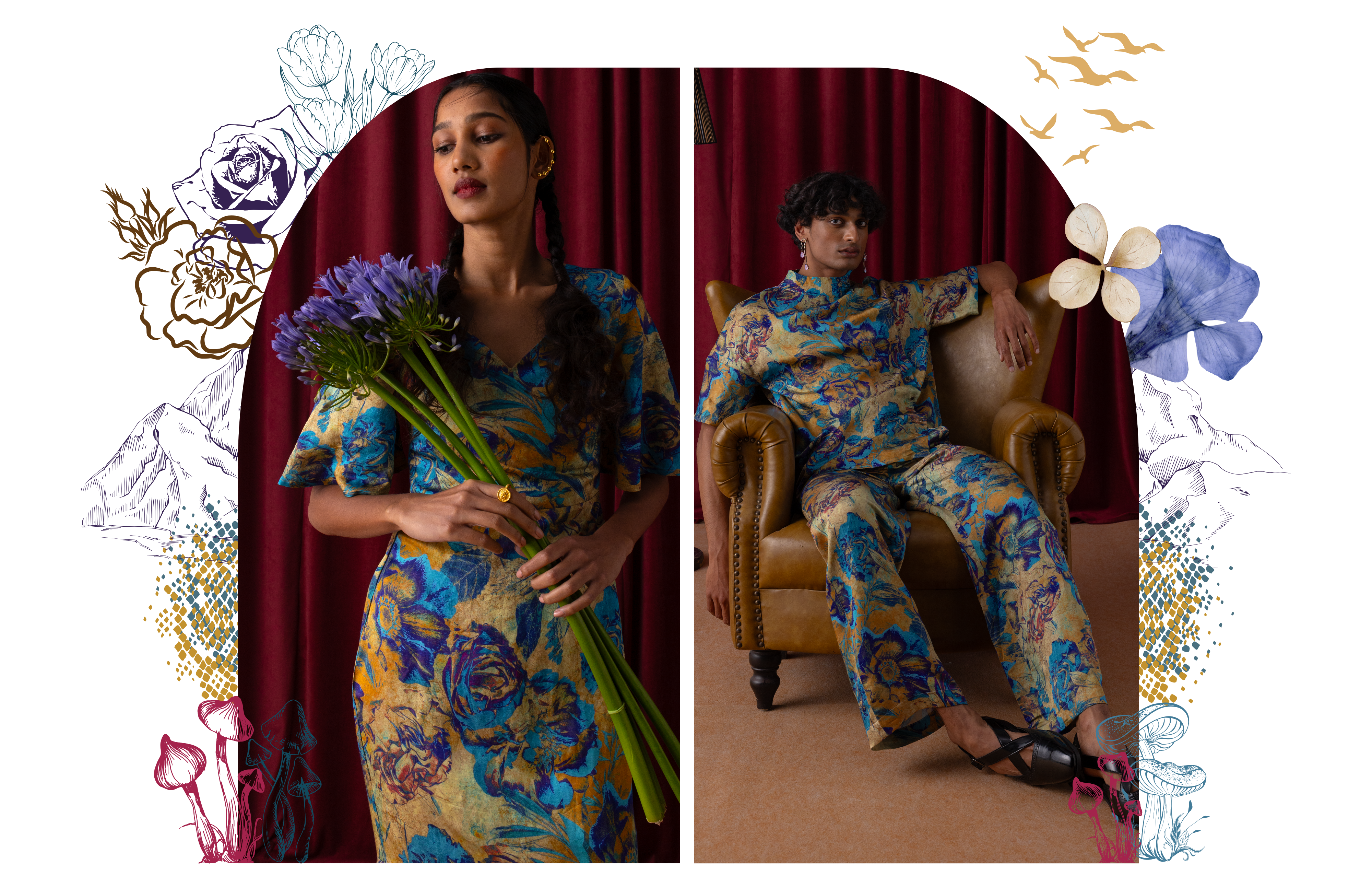 Wildoria takes inspiration from the Nilgiris in India’s Western Ghats, known for its rich biodiversity and scenic landscapes. The collection reimagines this natural world through a blue-green-gold palette that mirrors the region’s forests, mist, and golden light. Each piece reflects the Nilgiris’ essence, floral motifs draw from the blue flowers that bloom during golden hour, while snake-inspired prints capture the fluid elegance of the region’s fauna. Fungi patterns bring in the forest’s nocturnal beauty, adding depth and intrigue. By blending these natural elements with modern design, Wildoria translates the untamed elegance of the Nilgiris into contemporary silhouettes that carry the spirit of its landscape and life.