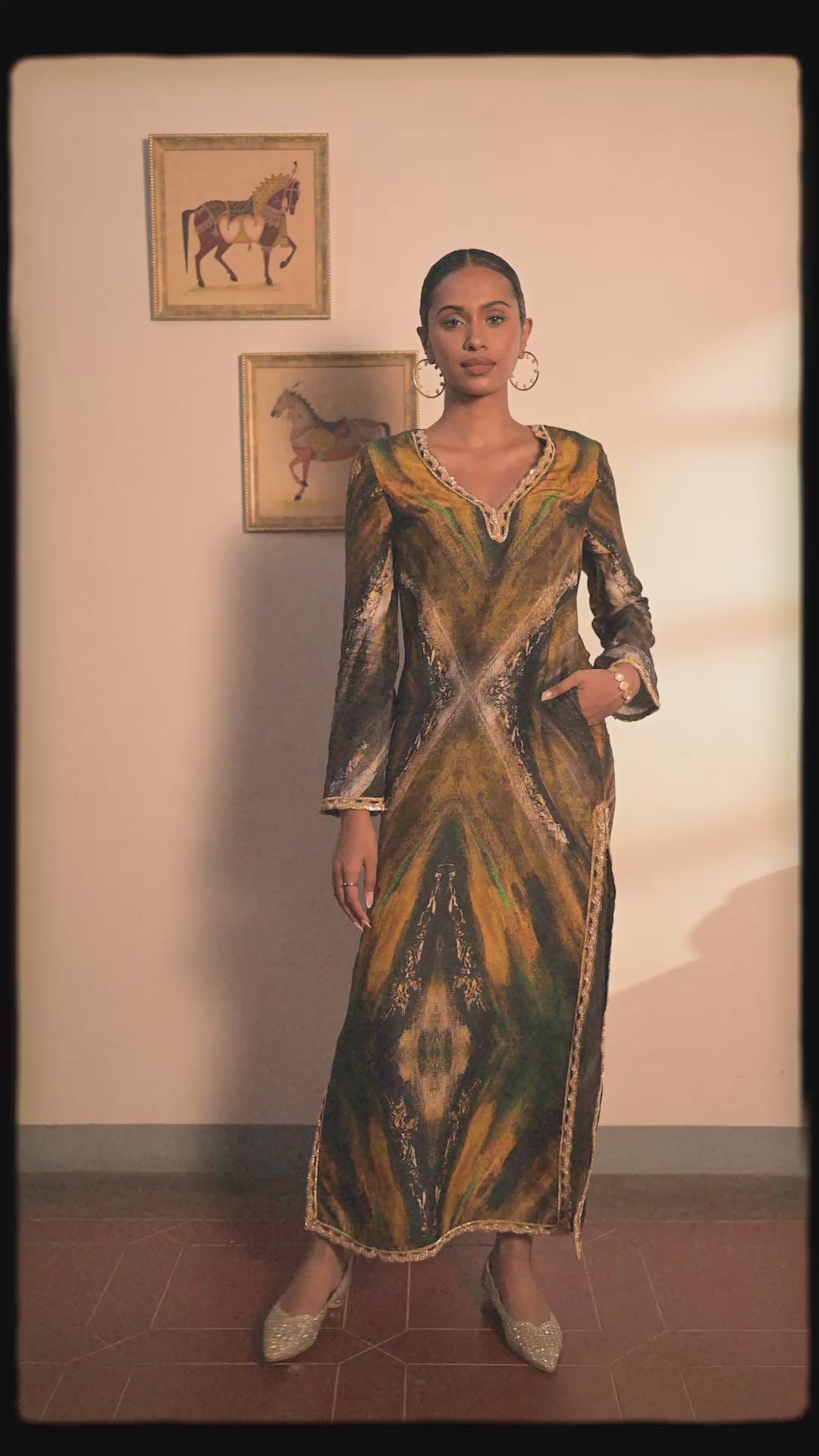 Solara Kaftan is a straight-cut kaftan that flows effortlessly with a minimal yet refined silhouette. Designed with a deep V-neckline, full-length sleeves, and knee-high side slits for graceful movement. The piece features in-seam pockets for functionality, while intricate lace detailing adorns the neckline, sleeves, hemline, and slits, adding subtle texture and depth. This unlined design embodies the quiet luxury and fluidity. This kaftan is not just designed in INDIA, but proudly MADE IN BANGALORE, INDIA.